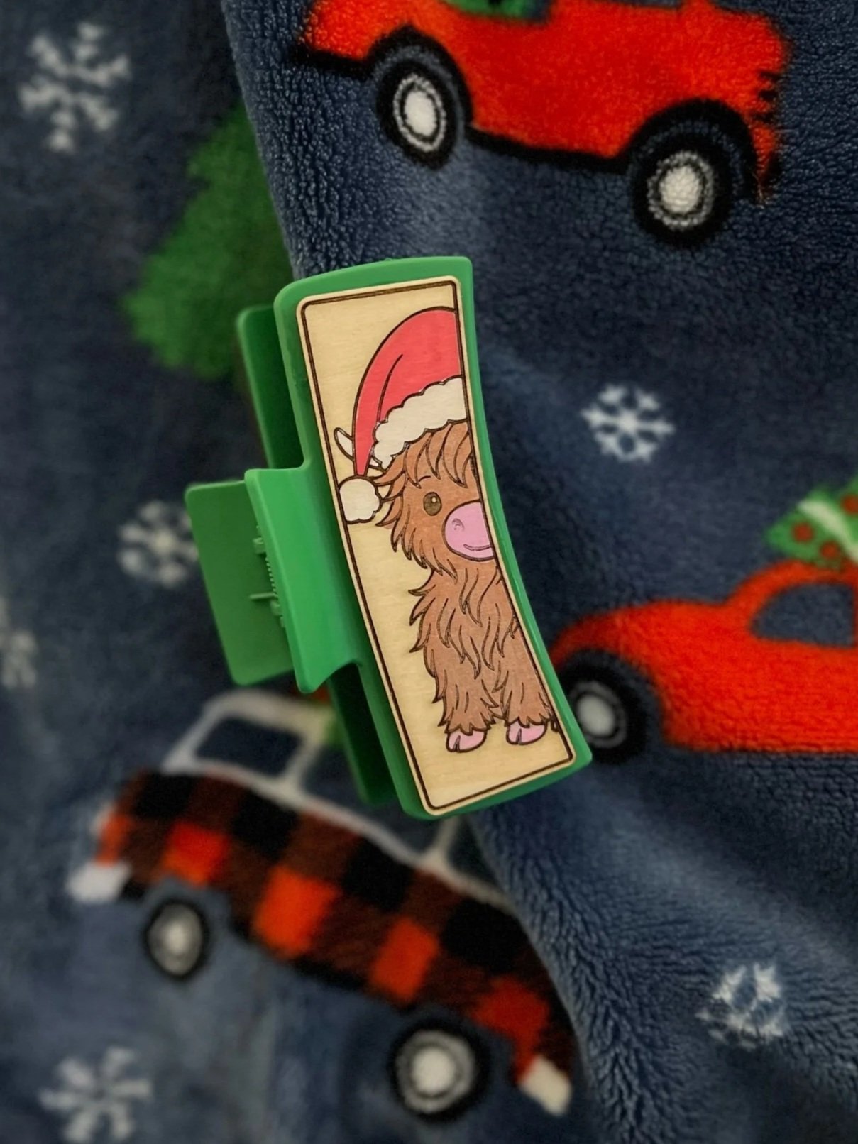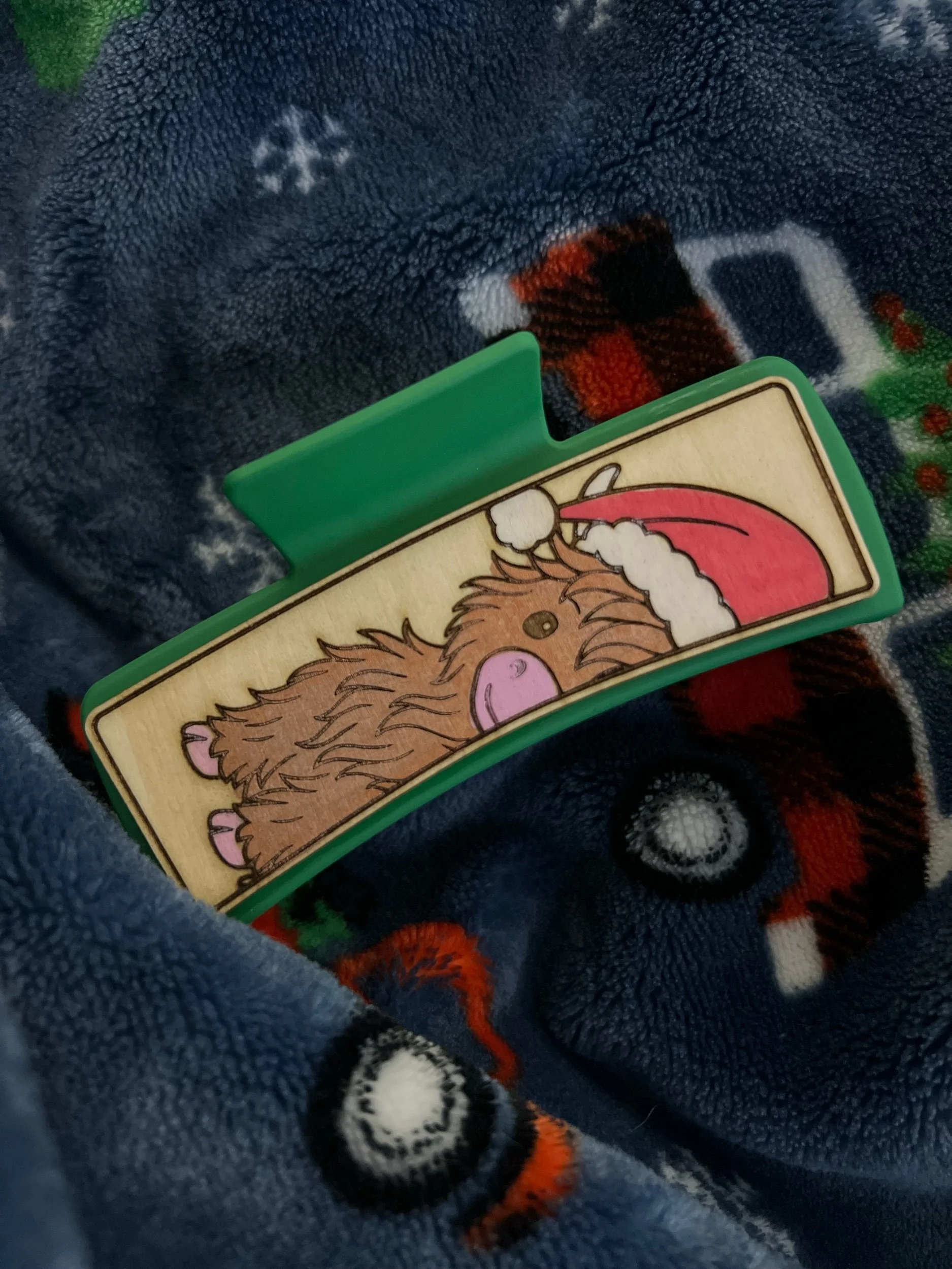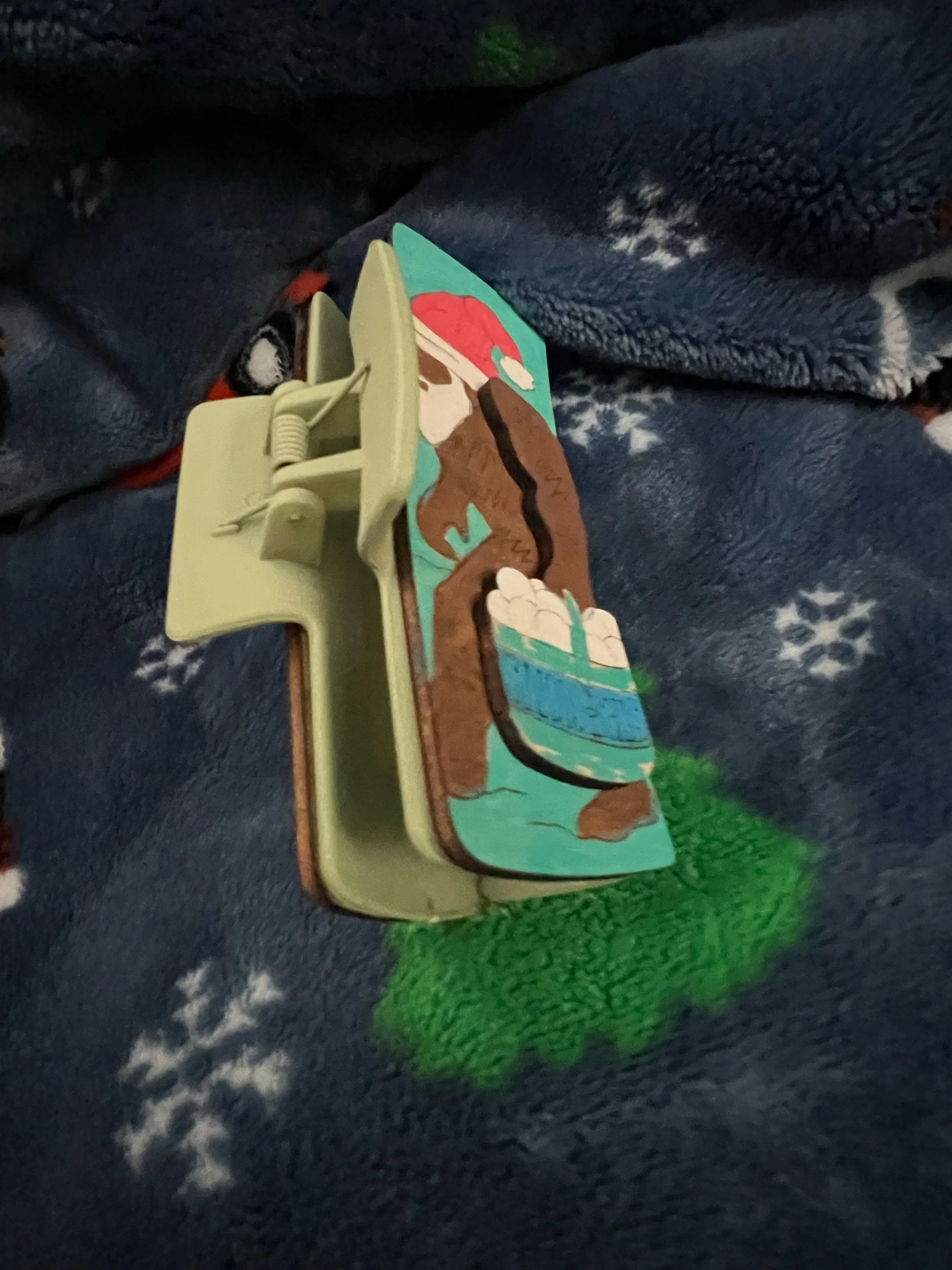 Big foot is laser engraved and hand painted onto the wood inlay on these hair clips.