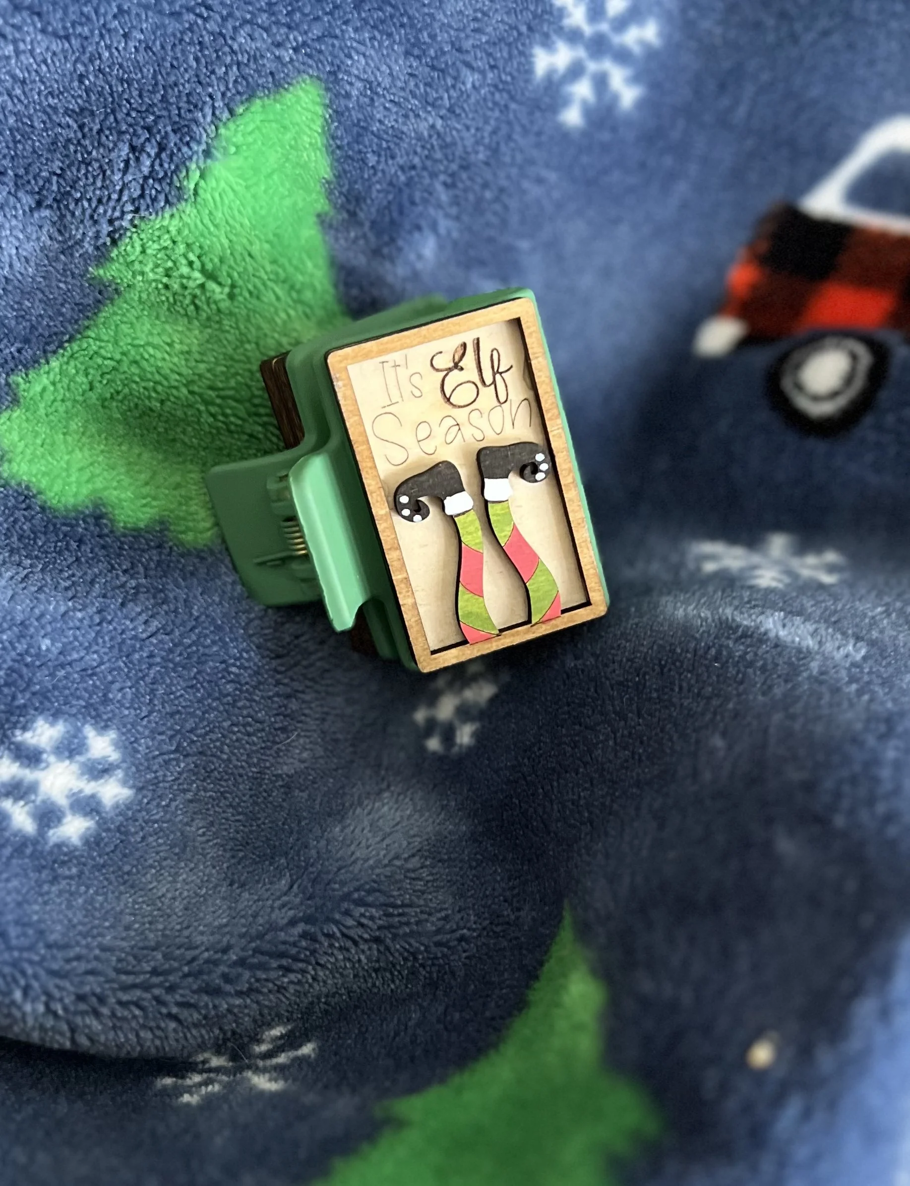 Wood panel is laser cut and engraved with Santa’s head and “HO HO HO” then hand painted.