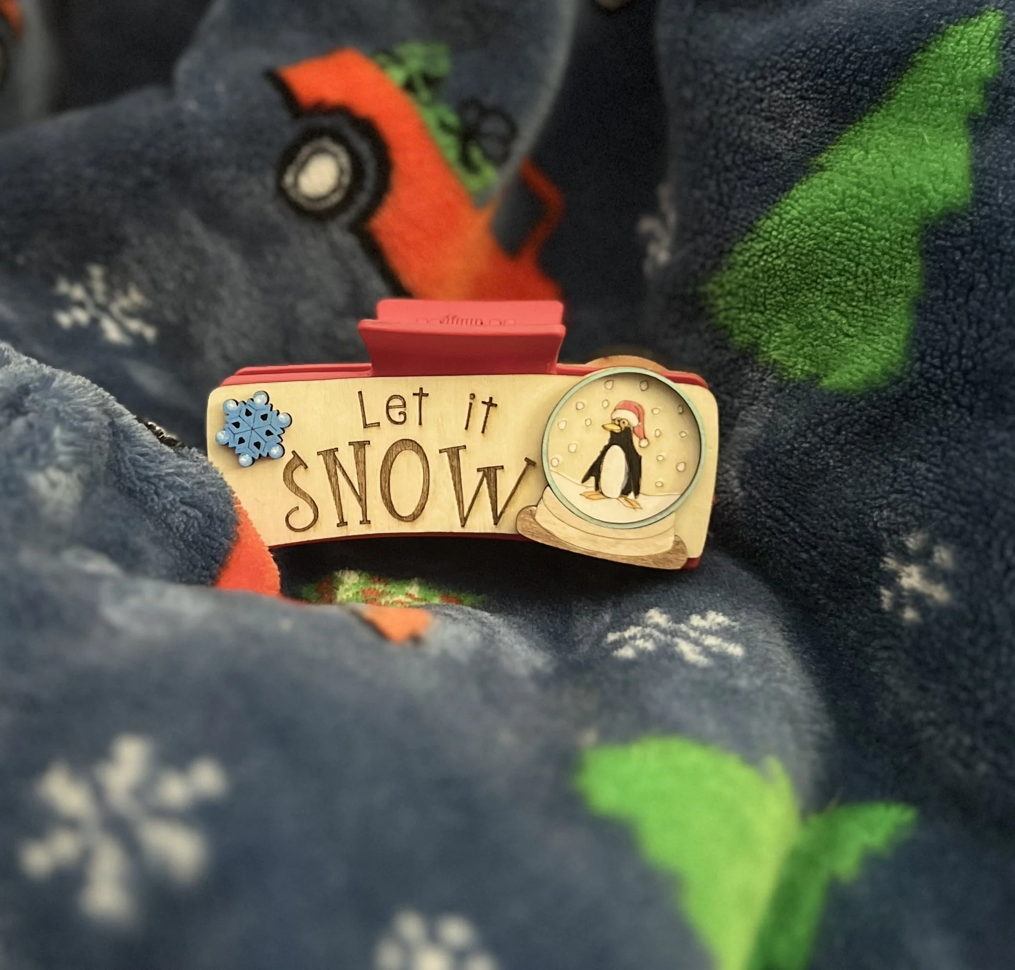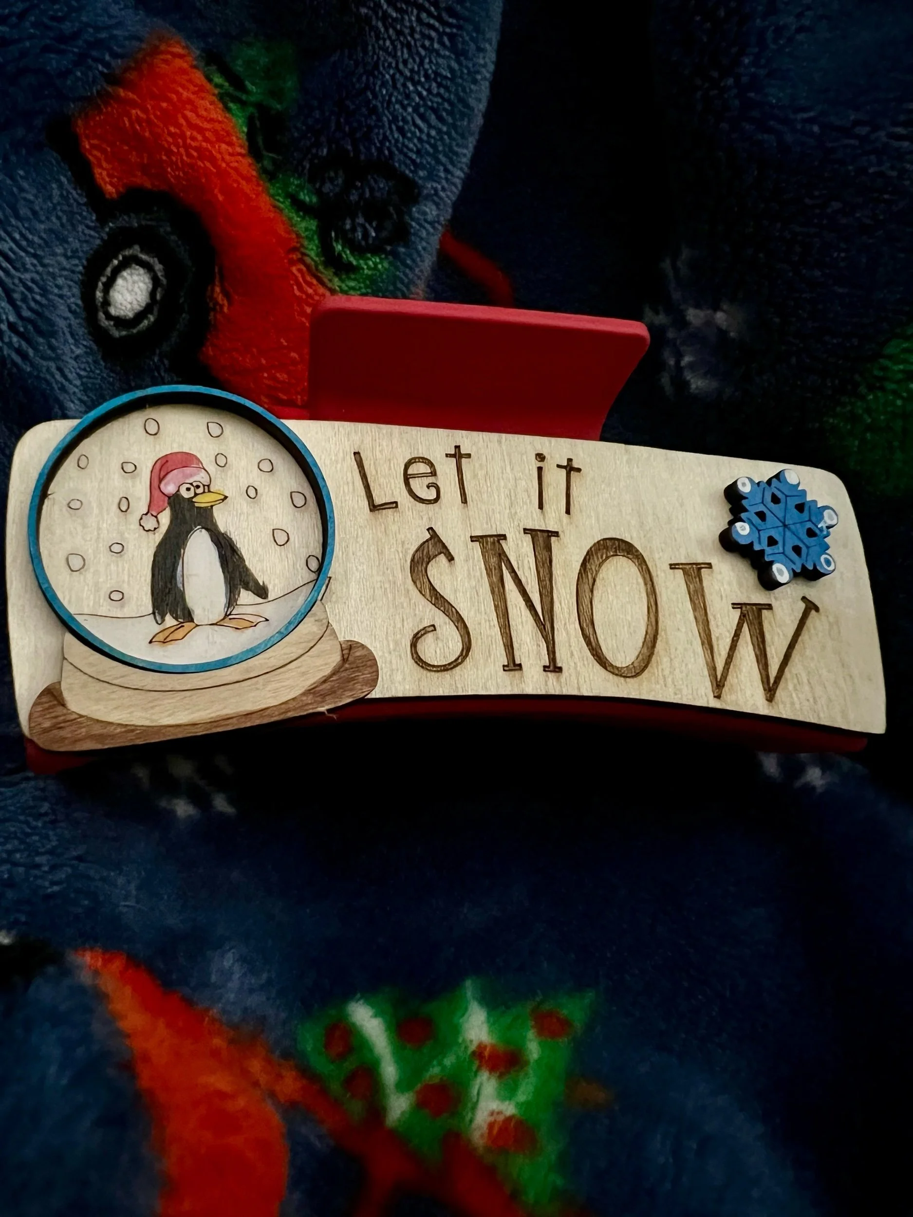 Wood panel is laser cut and engraved with a penguin in a snow globe and a snow flake with the words “Let it snow”, then it is hand painted.